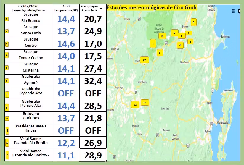 Abaixo está a tabela onde estão inseridos os volumes parciais de chuva (em preto) observados até a manhã de hoje, de Brusque a Vidal Ramos.