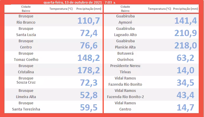 Alguns locais monitorados de Brusque e Guabiruba surpreendem no quesito "acumulado". Em 3 dias, já choveu 218, 0 mm no Planície Alta, 210,9 mm no Lageado Alto e 141,4 mm no Aymoré, ambos bairros de Guabiruba.