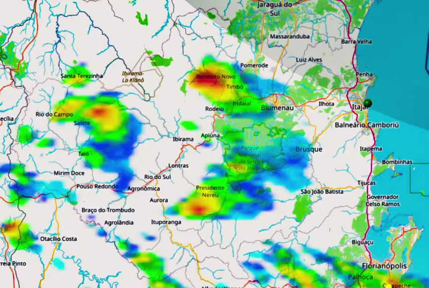 Condição de tempo severo se limita a locais bem isolados do Vale do Itajaí-Mirim, aponta o AlertaBlu