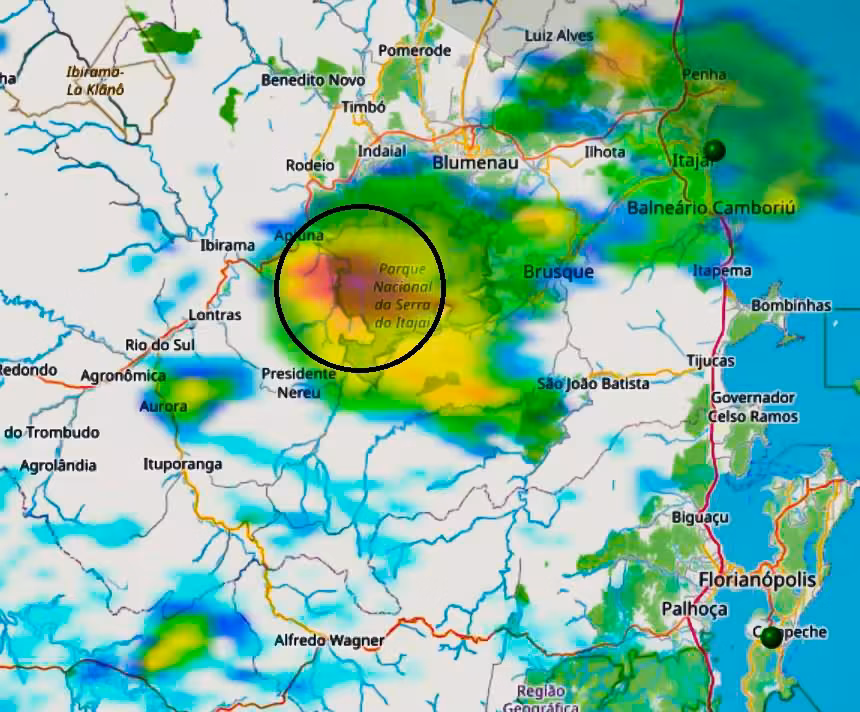 A imagem do Radar da Aeronáutica, atualizada às 14h30, mostrava nesse horário, tempo severo agindo sobre algumas áreas do Vale do Itajaí. Está ilustrado nas manchas coloridas da figura do mapa.