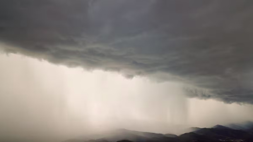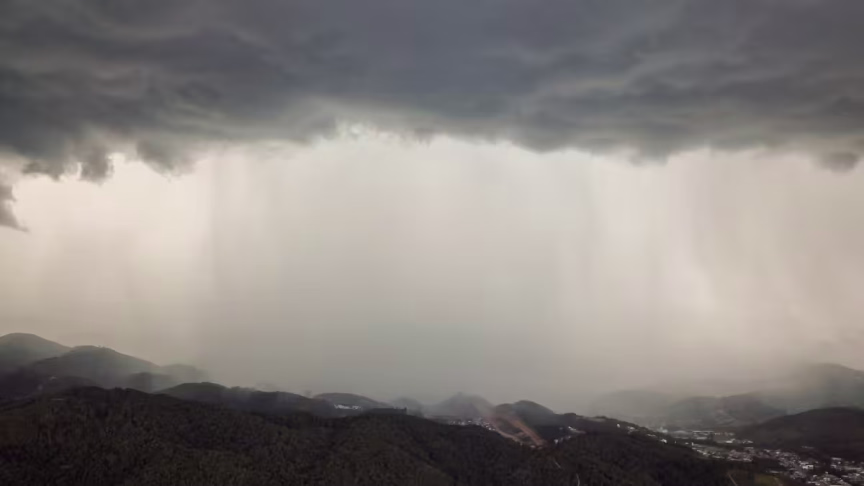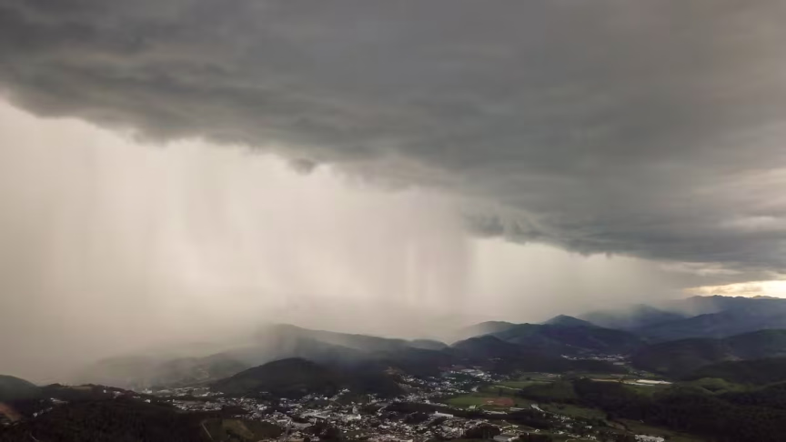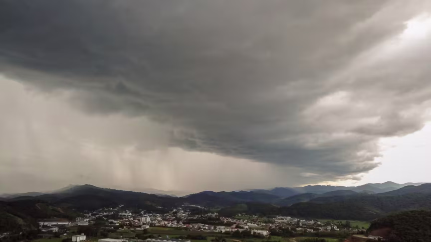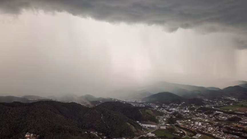 Imagens aéreas mostram as nuvens de temporais avançando sobre Brusque