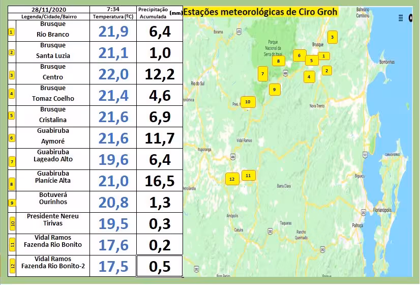 O tempo na madrugada deste sábado apresentou chuva por entre os municípios do Vale do Itajaí-Mirim. Pouca coisa no Alto Vale e mais no Médio Vale.