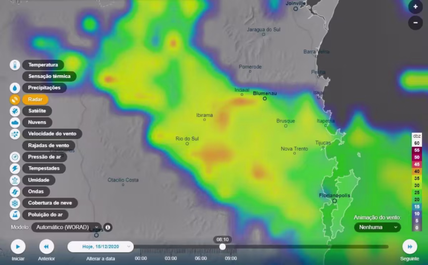 Na imagem de radar, atualizada às 8h10 desta manhã de terça, podemos ver uma extensa área com chuva nesse horário, que vai do Planalto Norte, passa pelo Vale do Itajaí chegando até o Litoral e Grande Florianópolis.