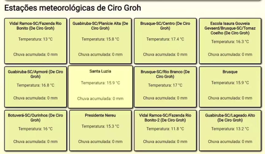 Abaixo estão as temperaturas medidas no Vale do Itajaí-Mirim às 07h30 deste sábado em cada local descrito em anexo. Não houve registro de chuva na região: