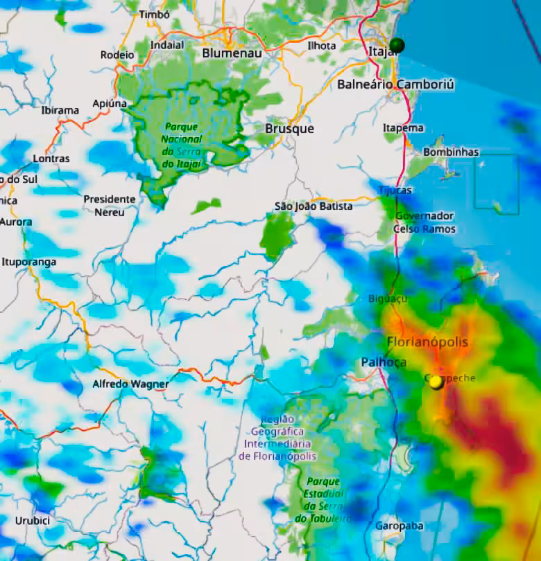 A imagem abaixo é do Radar da Aeronáutica. Foi atualizada no princípio da manhã desta terça-feira, às 7:30. Nesse horário era possível observar um núcleo forte de trovoada sobre Florianópolis e o mar.
