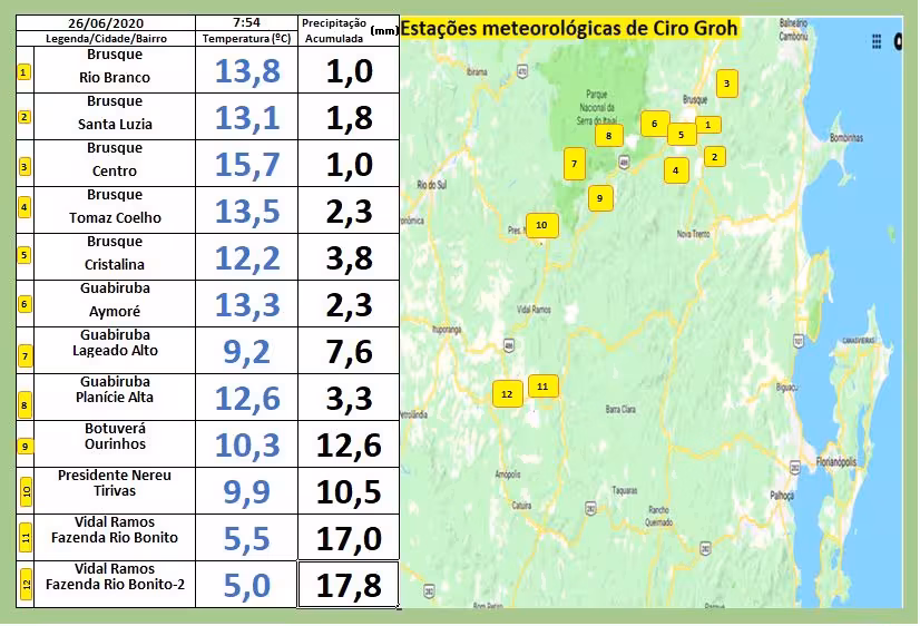 Brusque amanheceu com tempo seco nesta sexta-feira, 26, e os termômetros oscilaram mínimas entre 12 e 15ºC nas primeiras horas da manhã.