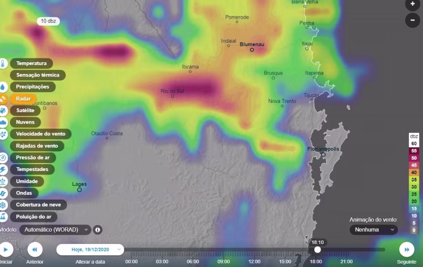 Na imagem de radar, atualizada às 18h20, podemos observar vários núcleos de trovoas sobre SC, em especial no Vale do Itajaí.
