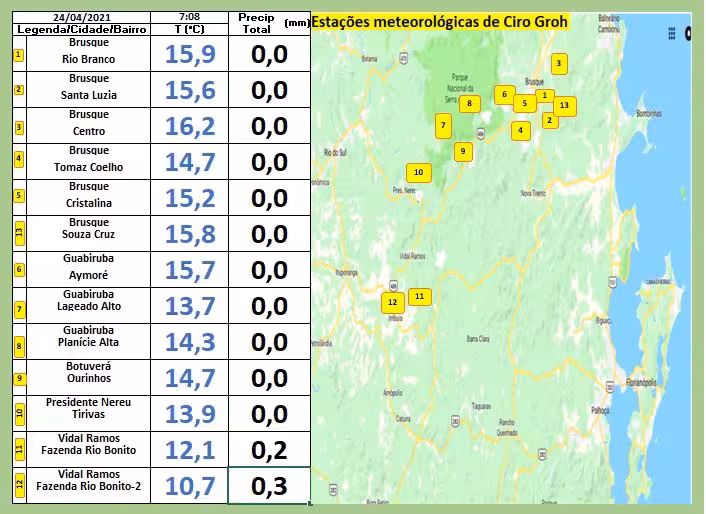 Já nas cidades de maior altitude do Vale do Itajaí-Mirim fez frio até representativo. Em Vidal Ramos, os moradores da localidade de Fazenda Rio Bonito amanheceram o sábado com apenas 10ºC.