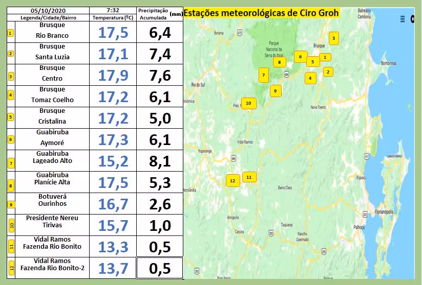 Confira abaixo as temperaturas mínimas (em azul), bem como, os volumes de chuva (em preto) registrados até 7h32 de hoje: