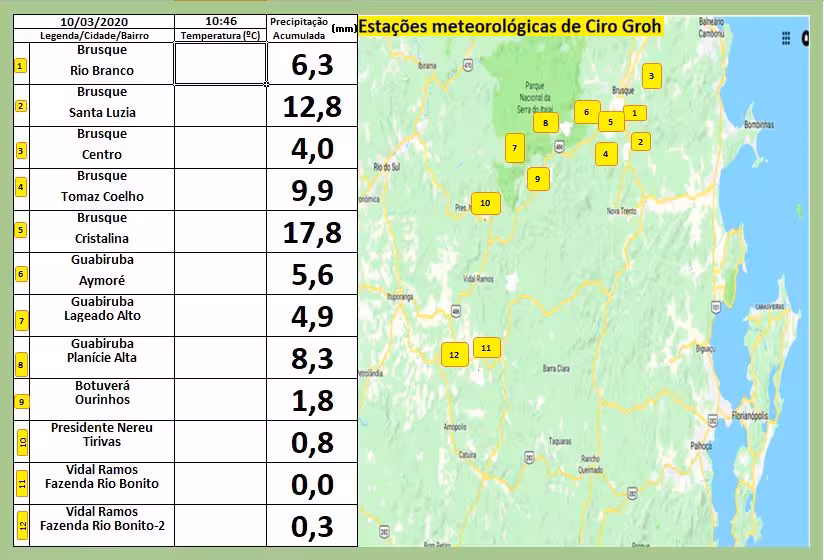A região das cabeceiras do rio Itajaí-Mirim atinge nesta terça-feira, 10, a marca de 13 dias sem chuva. A última precipitação registrada na localidade de Fazenda Rio Bonito, em Vidal Ramos, ocorreu em 26/02/2020 quando minhas estações mediram 37,3 mm.