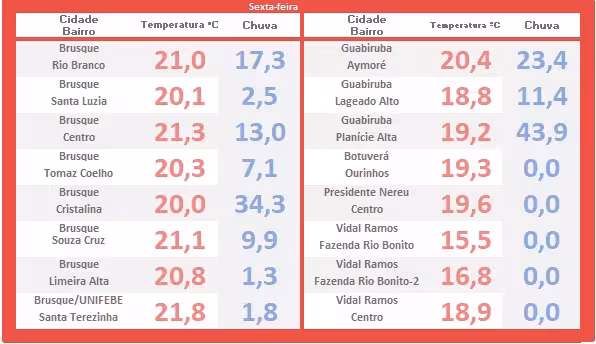 "Nesta quarta-feira o sol volta a aparecer sobre a região de Brusque, auxiliando na rápida elevação da temperatura, aumentando assim, a sensação de calor e abafamento no decorrer do dia, oscilando picos entre 32 a 34/35ºC".