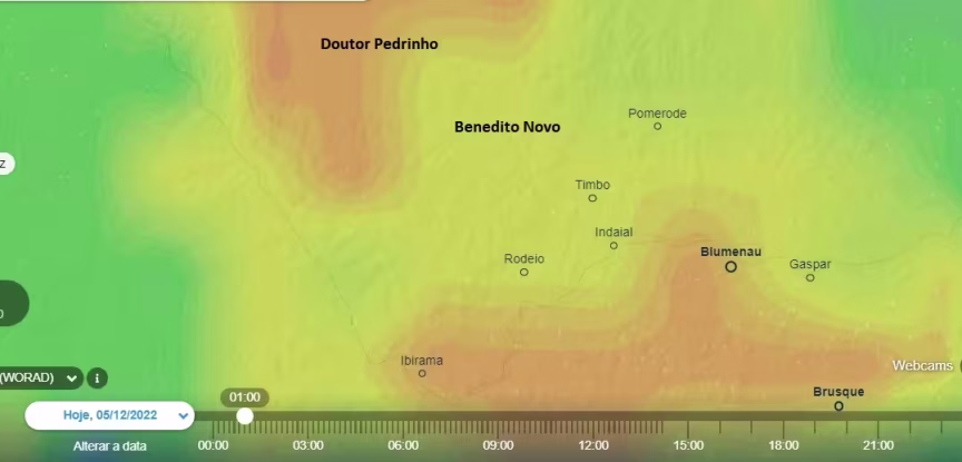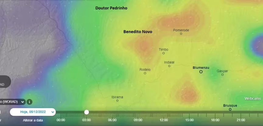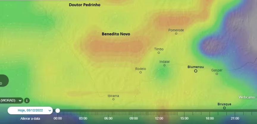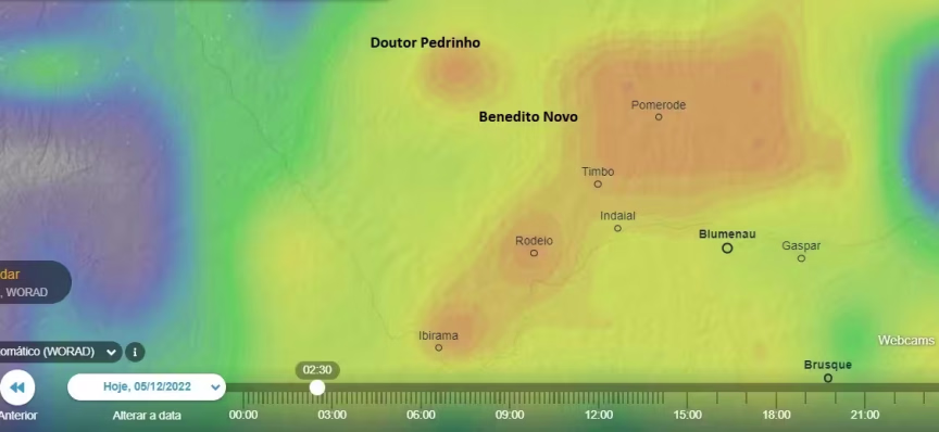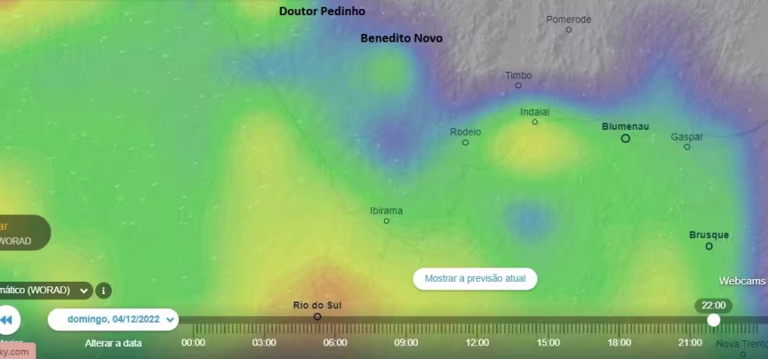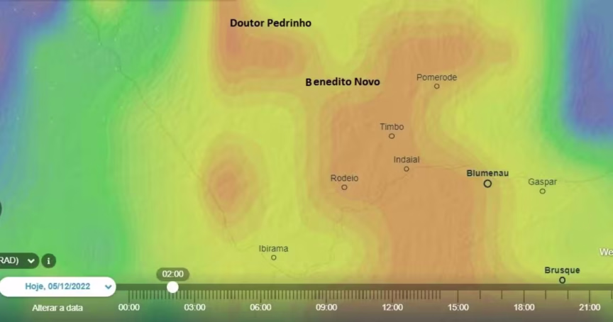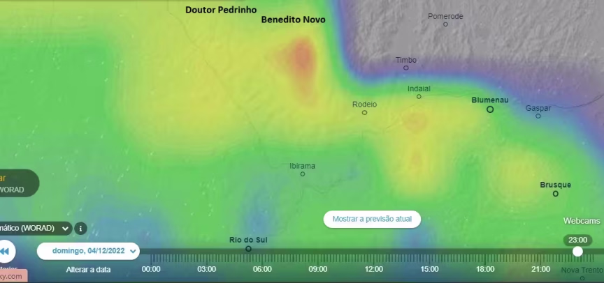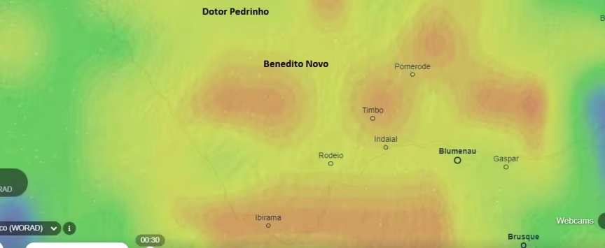 A chuva forte dava sinais de deslocamento, já começando a diminuir de intensidade em Doutor Pedrinho, embora Timbó, Pomerode e Benedito Novo ainda tivessem precipitação intensa: