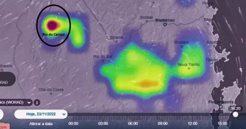 Um fato relacionado ao monitoramento das condições do tempo no Vale do Itajaí, chamou a atenção na tarde desta quarta-feira, 23. Uma imagem de radar, atualizada por volta de 16h30, mostrava em torno desse horário um intenso núcleo de trovoada com característica de temporal, sujeito a danos, atingindo o entono do município de Rio do Campo, no Alto Vale.