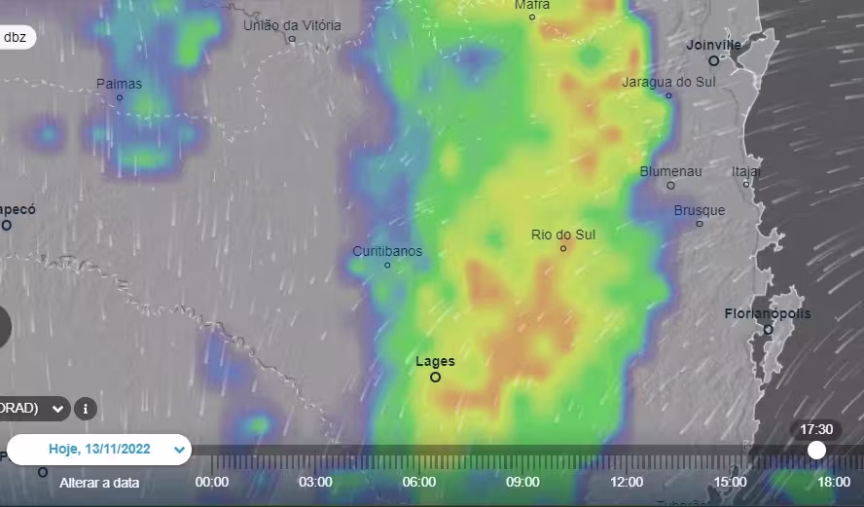 Uma imagem de radar, atualizada no fim da tarde deste domingo, 13, mostrava a chuva acompanhada de trovoadas com possíveis temporais avançando sobre o Vale do Itajaí. A figura exibida abaixo explica essa condição, nas manchas em vermelho ilustradas no mapa. Antes, a previsão divulgada pela manhã já anunciava essa mudança.