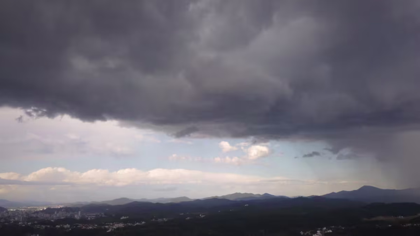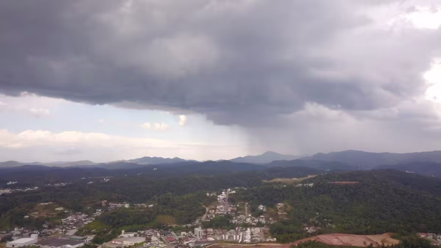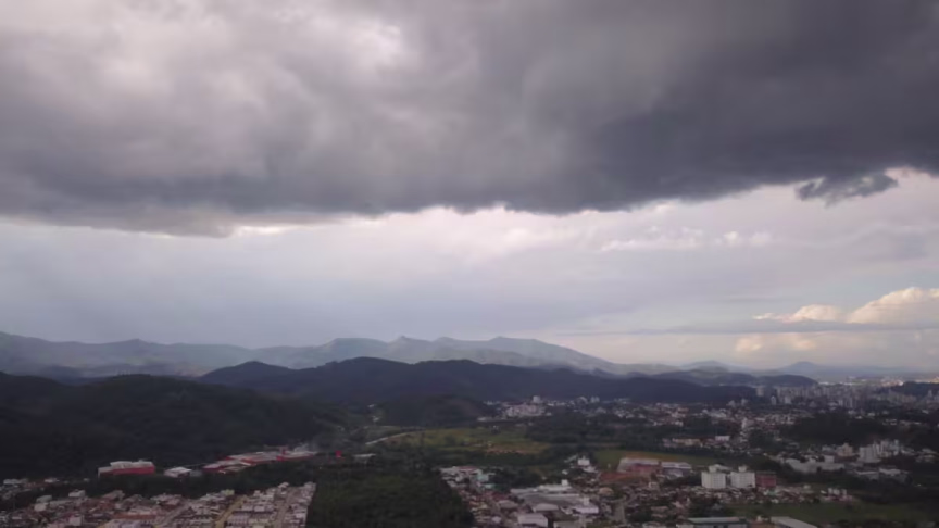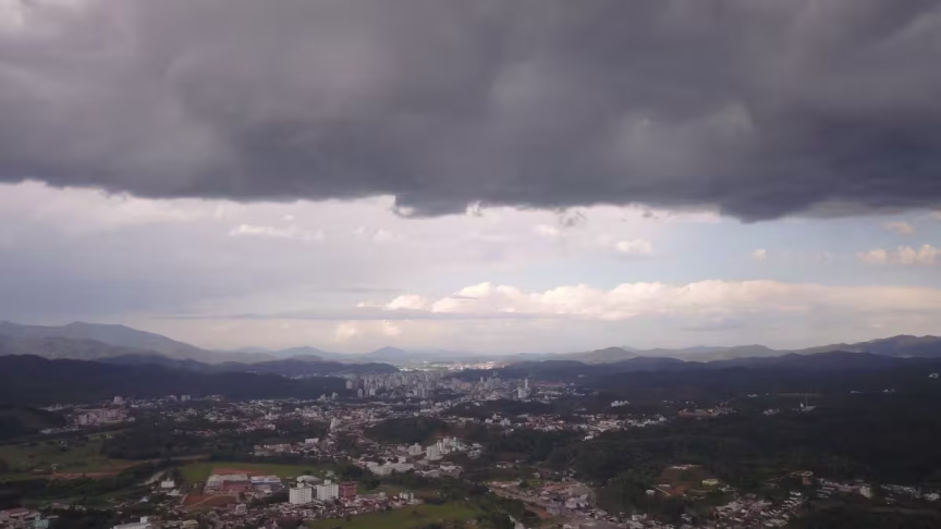 Acompanhe logo após o anúncio da Unifebe, as fotos aéreas capturadas em Brusque por volta de 17h30 deste domingo. As imagens ilustram o céu do município sendo tomado por nuvens densas, prenunciando a chegada do tempo mais severo.