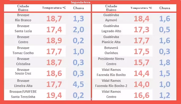 "Nesta segunda-feira, a região de Brusque tende a ter uma situação do tempo semelhante se comparado ao domingo. Ou seja, alternância entre céu nublado e parcialmente nublado, aberturas ocasionais de sol, com possibilidade de pancadas de chuva a qualquer hora do dia."
