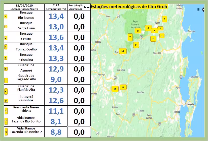 Situação não muito diferente em Vidal Ramos e Presidente Nereu, onde as estações de monitoramento apontaram 8ºC e 11ºC respectivamente.