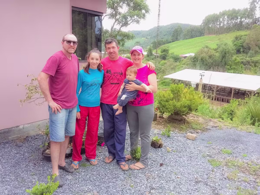 Na foto, estou com a família Brambila, que gentilmente cedeu o espaço em sua propriedade para que minha estação meteorológica pudesse passar a operar nesse entorno, onde se situam as nascentes do rio Itajaí-Mirim.