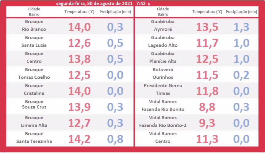 "Guarda-chuvas à mão até a quarta-feira, pois até lá, o sol até aparece, mas em curta duração. Segue a condição favorável a garoa ou chuva fraca e isolada em grande parte do Vale do Itajaí".