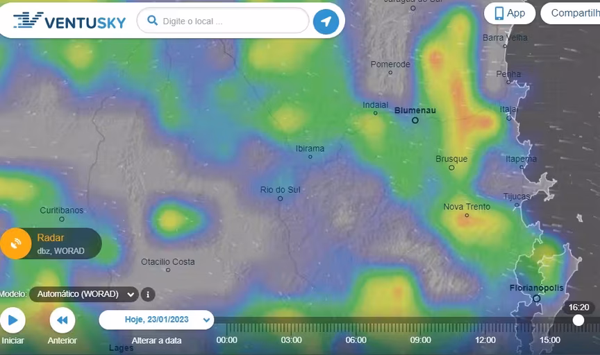 A imagem do Ventuski Radar exibida abaixo, atualizada às 16h20 desta segunda-feira mostrava nesse horário, alguns núcleos de trovoada impactando parte de Brusque e algumas cidades do entorno, ilustrados nas machas em amarelo e vermelho da figura do mapa.