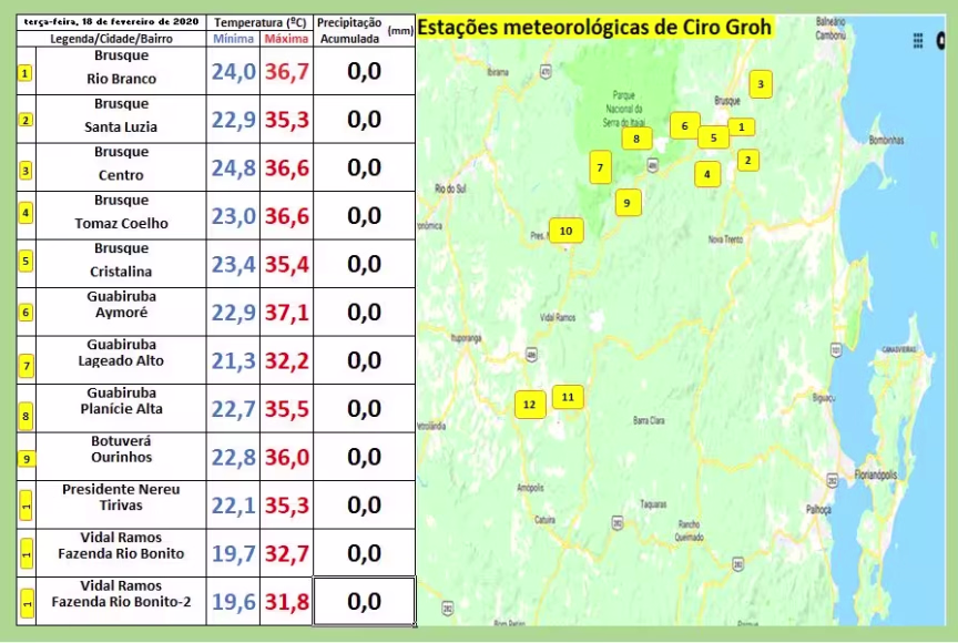 Abaixo está a tabela onde temos inseridas as temperaturas extremas (mínimas e máximas) desta terça, em seus respectivos lugares descritos em anexo. Muito quente em todos os municípios do Vale do Itajaí-Mirim: