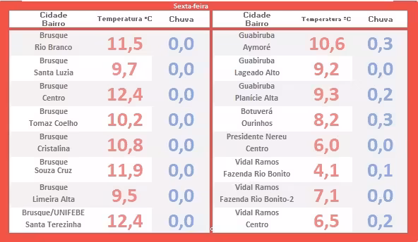Confira na tabela abaixo o levantamento completo das temperaturas mínimas registradas durante a madrugada e o amanhecer desta sexta-feira em toda a região de Brusque. Os dados foram coletados pela rede Groh Estações.