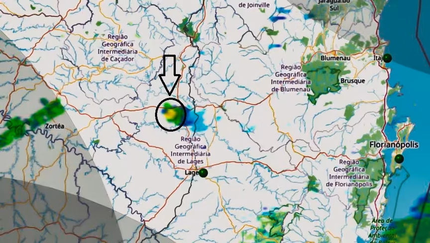Na imagem apresentada ao final da tarde de hoje pelo Radar da Aeronáutica, podemos observar um pequeno núcleo de chuva no Meio Oeste de SC, ilustrado na mancha em amarelo da figura do mapa: