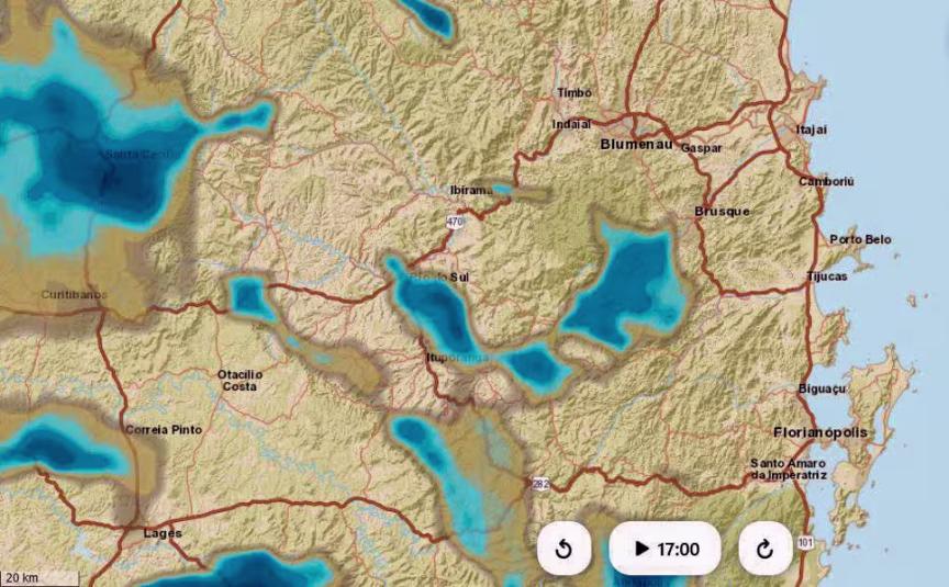 Na sequência, temos uma imagem de radar, atualizada às 17h desta segunda-feira. Com base nesta ilustração, podemos observar apenas chuviscos ou chuva fraca em áreas isoladas do Vale do Itajaí nesse horário.
