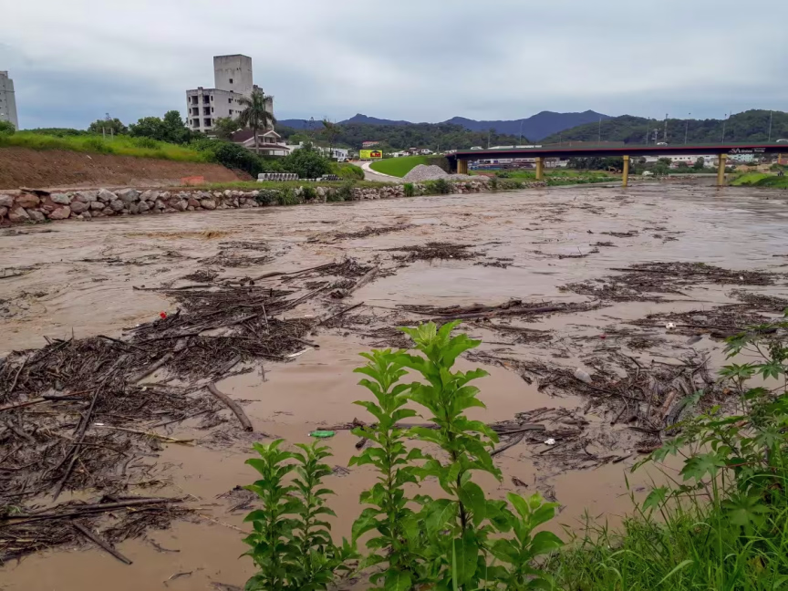 Com isso, o Itajaí-Mirim elevou seu nível a 4,65 metros e o resultado foi muita sujeira acumulada em plena região central da cidade.