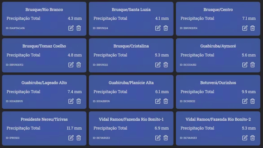 Os acumulados registrados oscilaram índices entre 4 a 11 mm, dependendo do município. O maior valor medido até 19h30 foi de 11,4 mm, assinalado em Presidente Nereu.