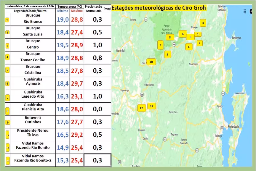 Abaixo está a tabela onde podemos observar os índices extremos apresentados pelos termômetros (mínimas e máximas) no Vale do Itajaí-Mirim, em cada lugar descrito em anexo.