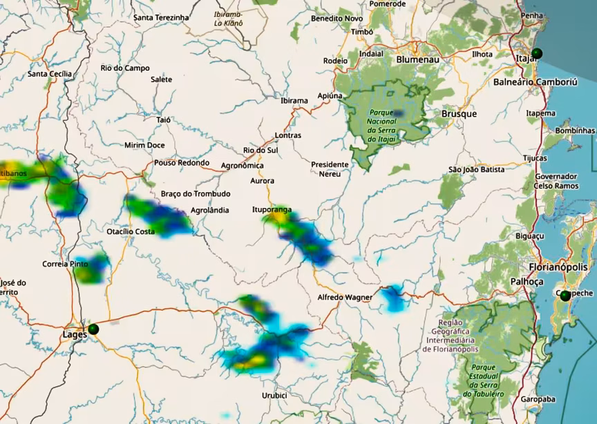 A seguir temos a imagem do Radar da Aeronáutica, atualizada às 16h30 de hoje, onde nesse horário, alguns núcleos de chuva com possível trovoada agiam de forma isolada sobre alguns municípios do Alto Vale do Itajaí, ilustrados nas manchas coloridas da figura do mapa: