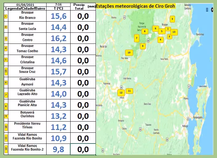 Com efeito, a exemplo do dia anterior, as mínimas ao amanhecer outra vez caíram até os 9ºC neste início de abril. Veja as mínimas de hoje por toda a região:
