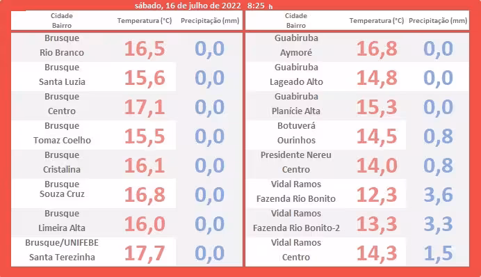 Confira a seguir como ficaram as temperaturas mínimas durante a madrugada e amanhecer deste sábado por todo o Vale do Itajaí-Mirim. Veja também quanto choveu no período em cada local monitorado.
