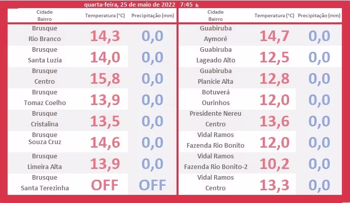 Prosseguindo com a edição desta quarta-feira vamos continuar falando do tempo, agora, destacando a madrugada que passou no que tange os valores de temperaturas mínimas assinalados no Vale do Itajaí-Mirim.