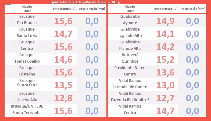 Seguindo com a edição do tempo desta quarta-feira, 20, vamos destacar agora, as temperaturas mínimas registradas na madrugada que passou por todo o Vale do Itajaí-Mirim.