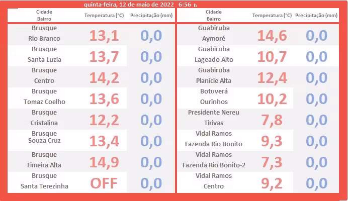 A projeção acima resumida será apresentada em detalhes mais adiante, pois antes, vamos destacar a madrugada que passou. Fez frio na região brusquense, sendo que alguns locais monitorados começaram a quinta-feira em até 7ºC.