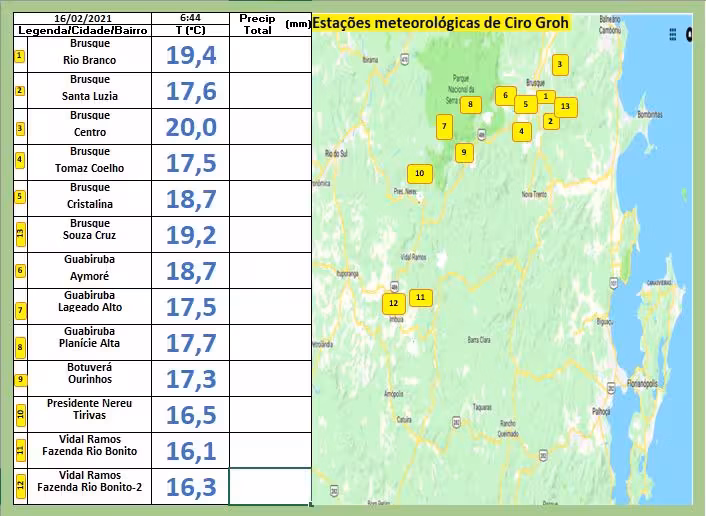 Abaixo temos a tabela, que mostra os índices extraídos das estações de monitoramento instaladas em cada lugar descrito em anexo no Vale do Itajaí-Mirim: