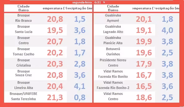 A tabela exposta abaixo mostra o levantamento das temperaturas mínimas pontuadas logo após o romper da aurora correspondentes a cada local descrito em anexo(em vermelho). Confira também os volumes de chuva assinalados até o amanhecer (em azul):