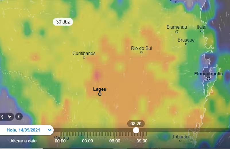 A seguir, temos exposta a imagem de radar, atualizada às 8h20. Nesse horário, era possível observar grande parte de SC com precipitação, sendo de moderada a forte intensidade apenas nas manchas avermelhadas da figura do mapa: