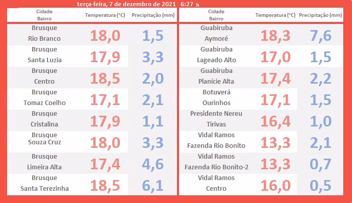 Confira na tabela exposta a seguir, os índices mínimos (vermelho), bem como, os dados de chuva (azul) observados durante a madrugada e amanhecer desta terça, não só em Brusque, mas em todo o Vale do Itajaí-Mirim:
