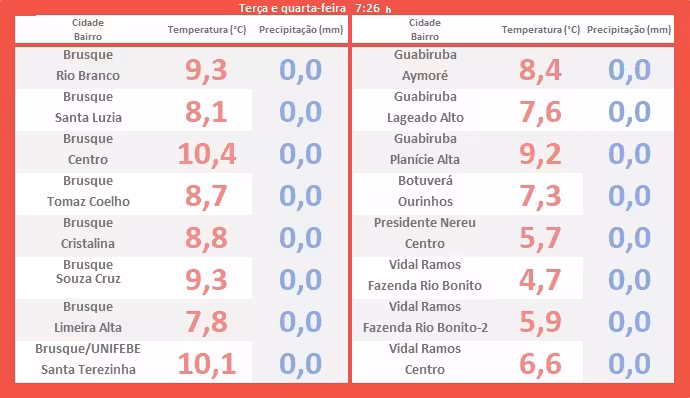 Acompanhe na tabela exposta abaixo as temperaturas mínimas assinaladas no período (vermelho). Não houve registro de chuva (azul). Os índices aferidos correspondem a cada local descrito em anexo.