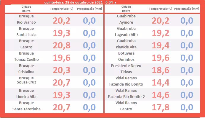 Abaixo você acompanha as temperaturas mínimas (vermelho) assinaladas logo após ao romper da aurora desta quinta-feira em cada local descrito em anexo na tabela. A madrugada que passou seguiu sem chuva registrada (azul) na região: