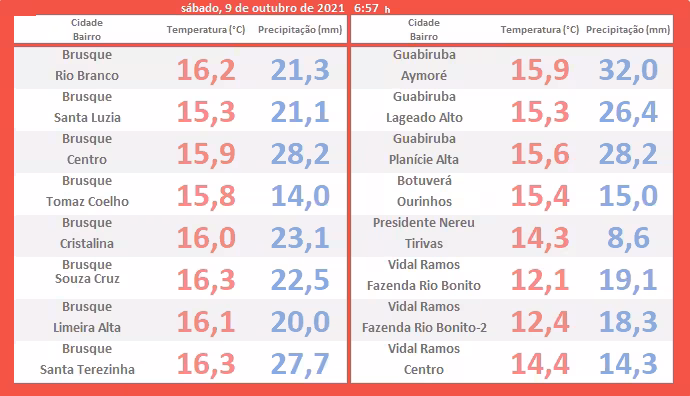 A propósito, essa precipitação que começou a cair de forma mais generalizada já na sexta-feira, 8, ao final da tarde, vem acumulando volumes representativos em Brusque e toda a região.