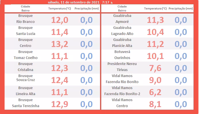 Em Brusque, o dia também começou bem ameno, com temperaturas oscilando 11 a 13ºC por entre os 8 pontos monitorados pelas estações da rede de Ciro Groh.