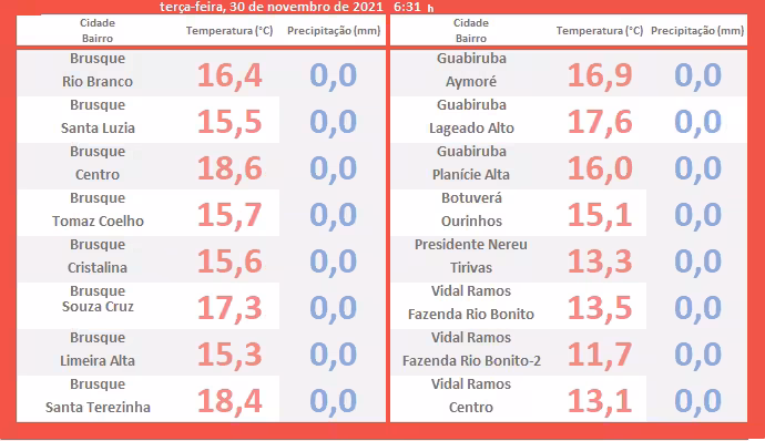 A tabela exposta a seguir vem mostrar as mínimas (vermelho) assinaladas pelos termômetros logo após ao romper da aurora desta terça em cada lugar descrito em anexo. Não houve registro de chuva (azul) na região no período da madrugada: