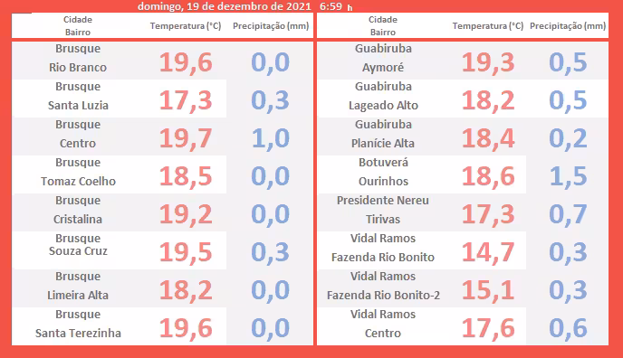 Mas antes de trazer os detalhes da projeção acima resumida, queremos primeiro destacar as temperaturas mínimas registradas entre a madrugada e amanhecer de hoje na região brusquense, que contou com a presença de chuviscos.