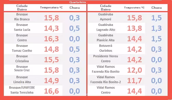 A tabela a seguir apresenta as temperaturas mínimas registradas logo após o amanhecer de hoje em cada local mencionado (indicado em vermelho). A apuração evidencia também, o registro de garoa em alguns pontos monitorados no decorrer da madrugada (marcado em azul).