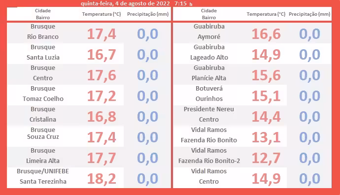 "Hoje, há expectativa de aquecimento um pouco maior por parte dos termômetros à tarde para vocês, brusquenses e moradores dos municípios do entorno. Os picos tendem a oscilar 26 a 28ºC".