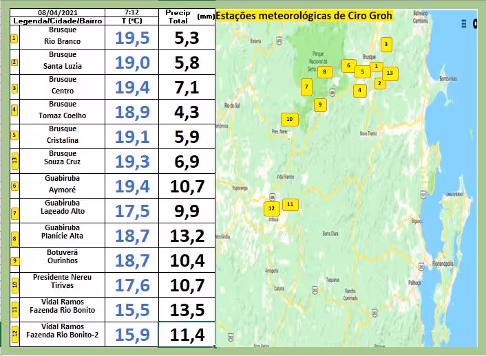 Saiba quanto choveu (em preto) até 7h12 em cada lugar descrito em anexo na tabela abaixo. Junto estão também, as temperaturas mínimas (em azul) assinaladas no período:
